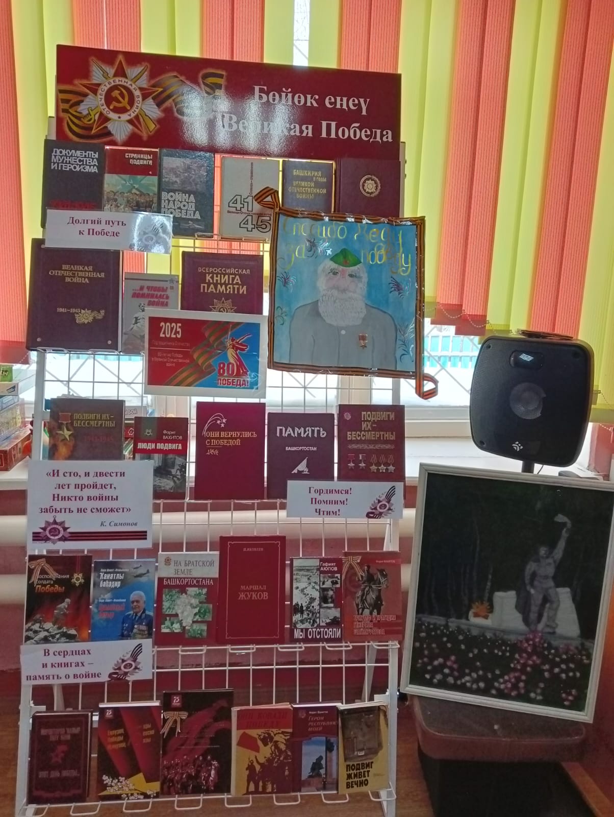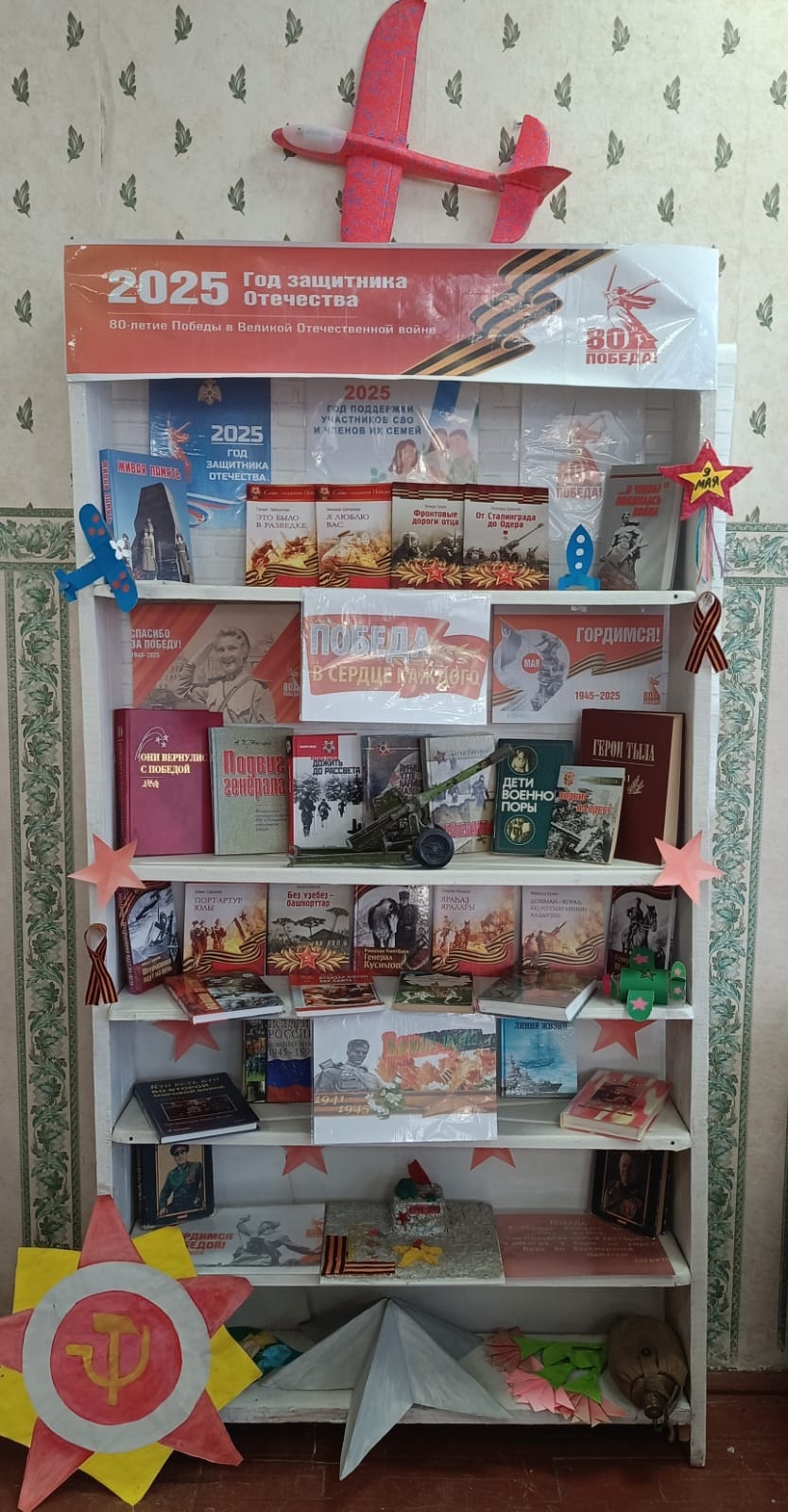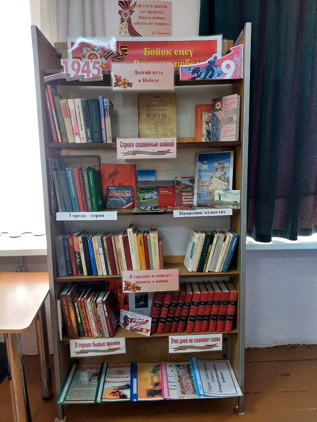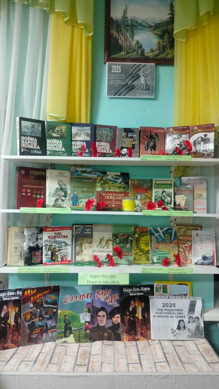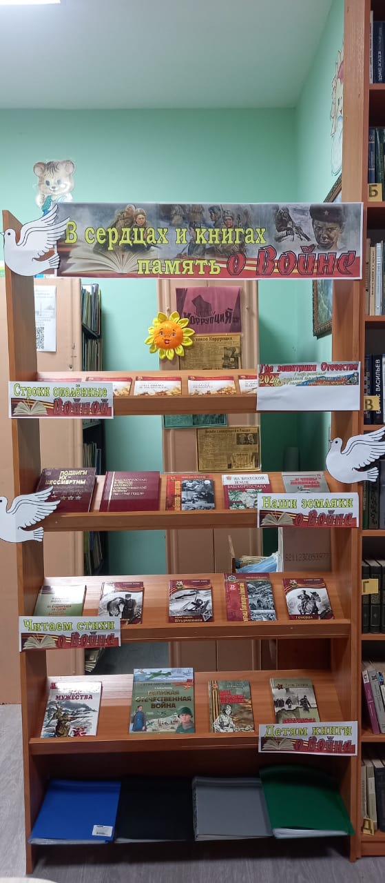 В рамках Года защитника Отечества в библиотеках Стерлитамакского района активно оформляются книжные выставки «Победа в сердце каждого». Выставки раскрывают ключевые события суровых военных лет через призму книг, рассказывающих о беспримерном мужестве и стойкости людей, отдавших свои силы и жизнь ради Победы. Умелыми руками наших библиотекарей книжные полки преобразились в настоящие произведения экспозиции, украшенные свечами памяти, гвоздиками, поделками юных читателей. Здесь можно увидеть книги из единой серии, уже известные авторы интересные новинки.