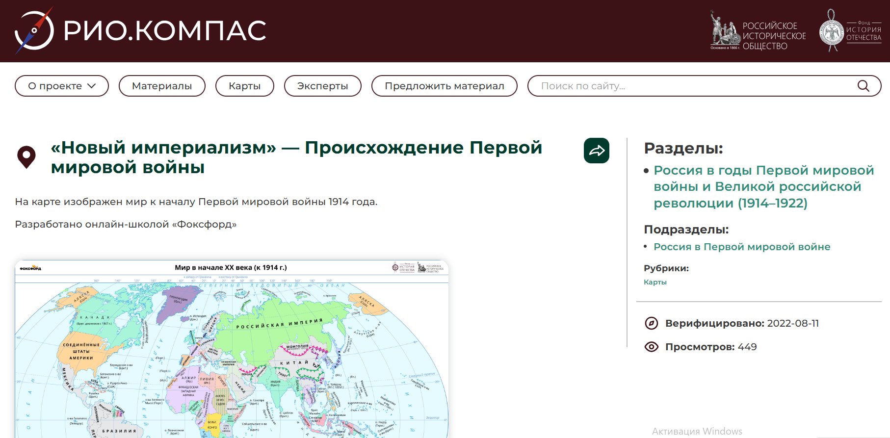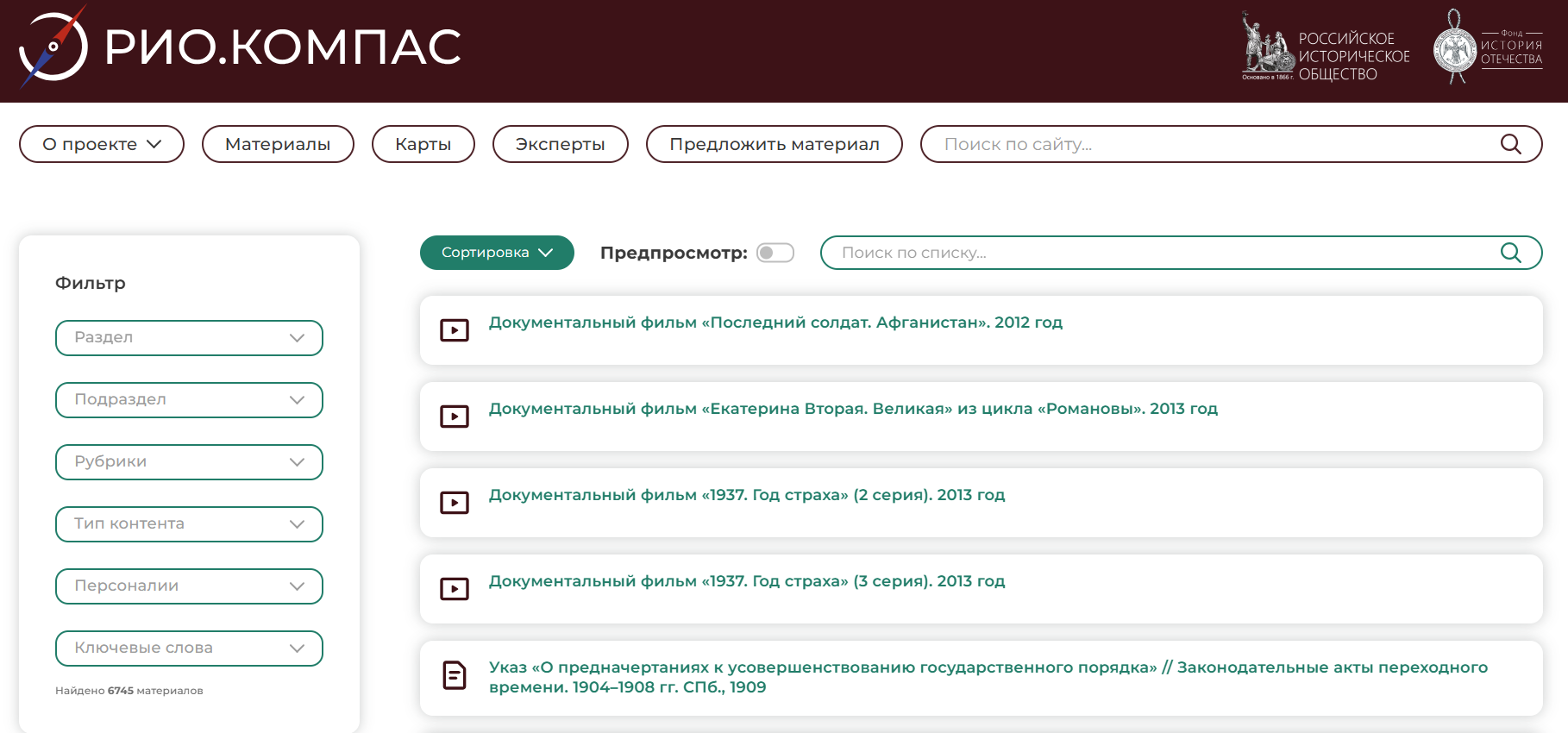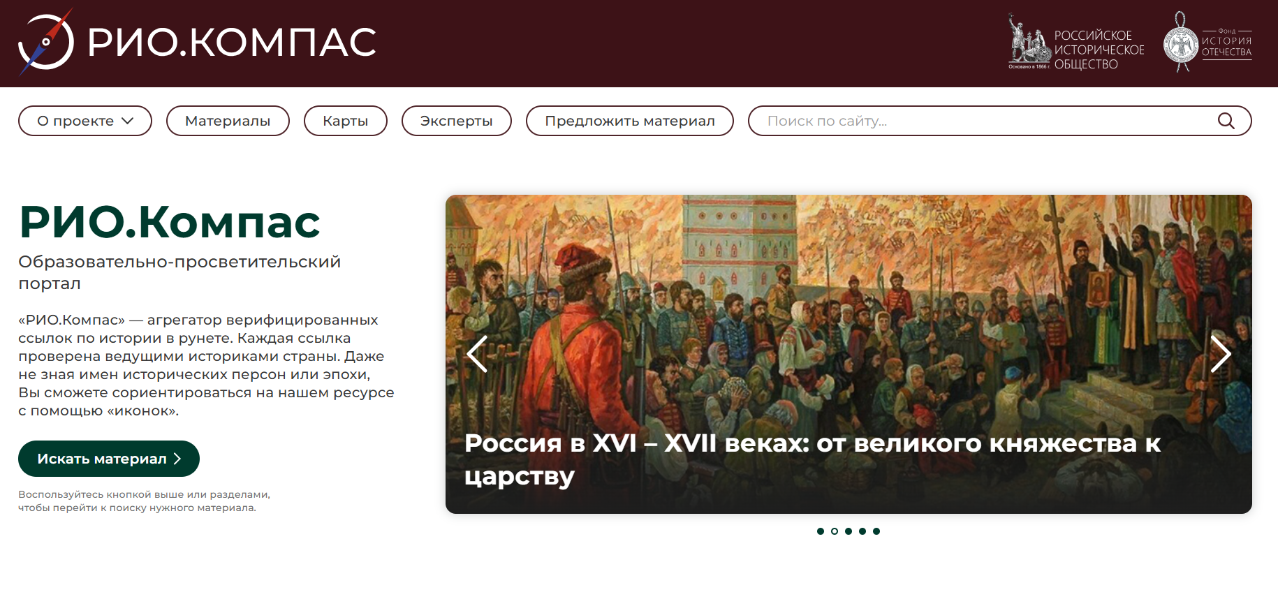Проект «РИО.Компас» – крупнейшая библиотека онлайн-ссылок на верифицированные исторические материалы, размещенные в Рунете. Это навигатор, позволяющий оперативно находить информационные и образовательные материалы, в том числе текстовые, видео- и аудио-материалы, по отечественной истории. Принципами РИО.Компаса являются достоверность рекомендуемых материалов, гарантированная профессиональным историческим сообществом, и системность при отборе онлайн-ссылок, что позволяет охватить все исторические периоды.