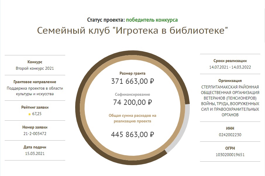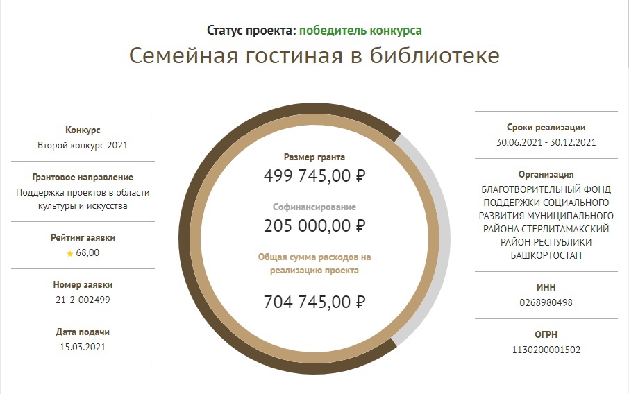 bc7b44d1f0ef10049b399b80758d5759       По итогам второго конкурса президентских грантов в 2021 году 69 социально-ориентированных некоммерческих организаций Башкирии стали победителями. Среди заявок, отмеченных экспертами – сразу 2 проекта Централизованной библиотечной системы Стерлитамакского района — «Семейная гостиная в библиотеке» (будет реализован в Тюрюшлинской модельной сельской библиотеке) и Семейный клуб «Игротека в библиотеке» (Алатанинская сельская библиотека). Общая сумма выигранного гранта составила 871 408 рублей.