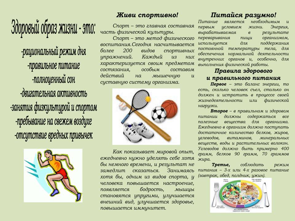 Одна из основных составляющих здоровья – это здоровый образ жизни — это такой образ жизни человека, который направлен на укрепление здоровья и профилактику болезней. Иными словами, здоровый образ жизни — это список правил, соблюдение которых максимально обеспечит сохранение и укрепление здоровья (как физического, так и психического).