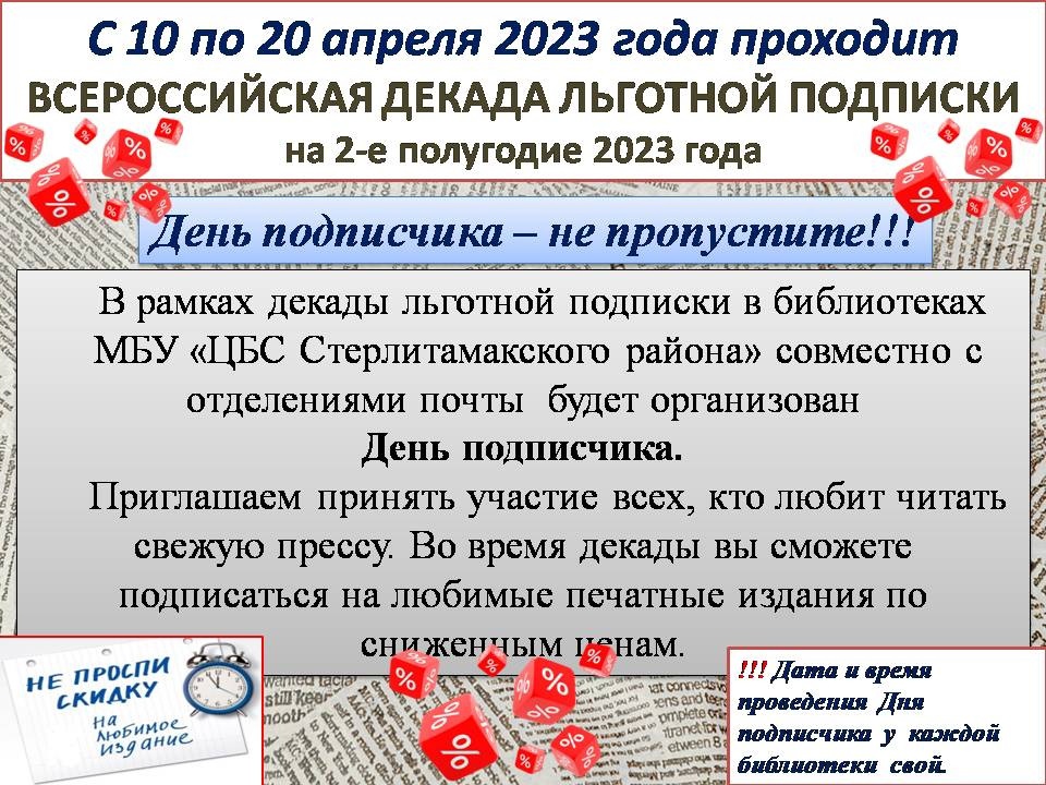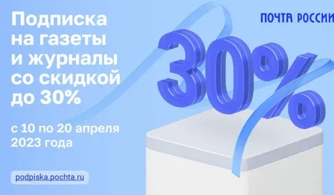 «Почта России» объявляет декаду подписки на второе полугодие 2023 года! С 10 по 20 апреля можно получить максимальную скидку на получение периодических печатных изданий. Точную дату и время уточняйте в сельских библиотеках своего населенного пункта.