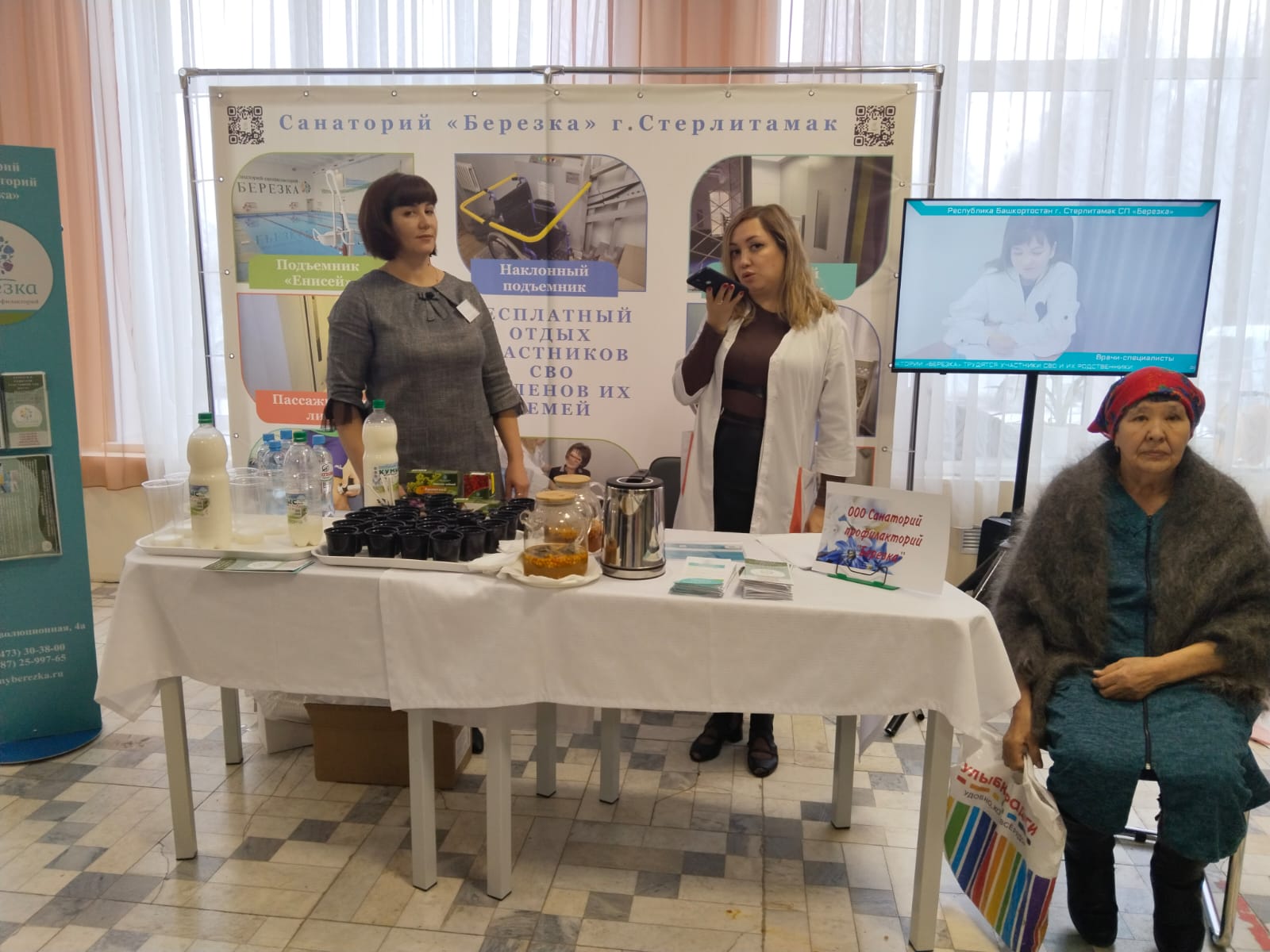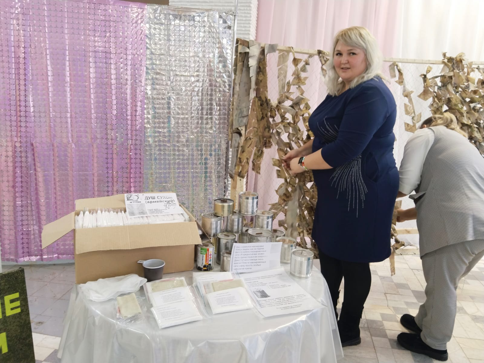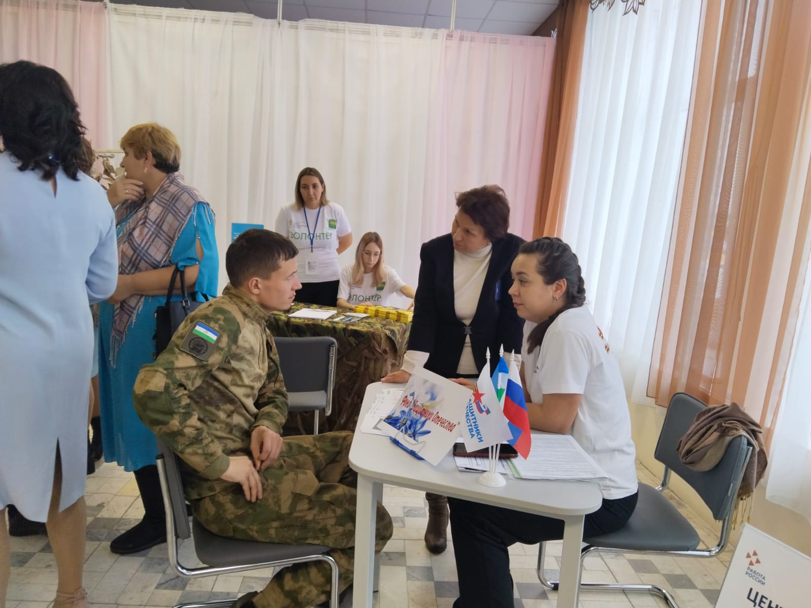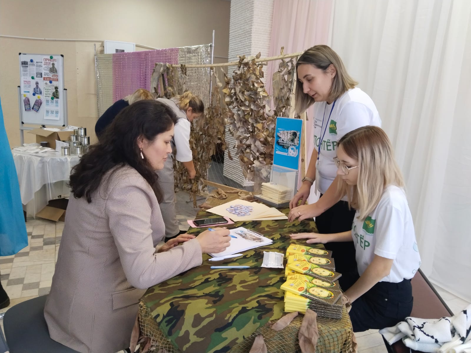 На первом этаже для всех приглашённых работала «Патриотическая площадка», на которой разместились различные тематические пространства – площадка по плетению маскировочной сети, письмо солдату — можно было написать письмо солдатам, которые находятся сейчас в зоне проведения СВО, мастер — класс «Берегиня». Работали также площадки: консультации специалистов по санаторному лечению, социальные педагоги, нотариусы, юристы, представители банка, МФЦ, Опека, Государственный фонд поддержки участников СВО «Защитники Отечества».
