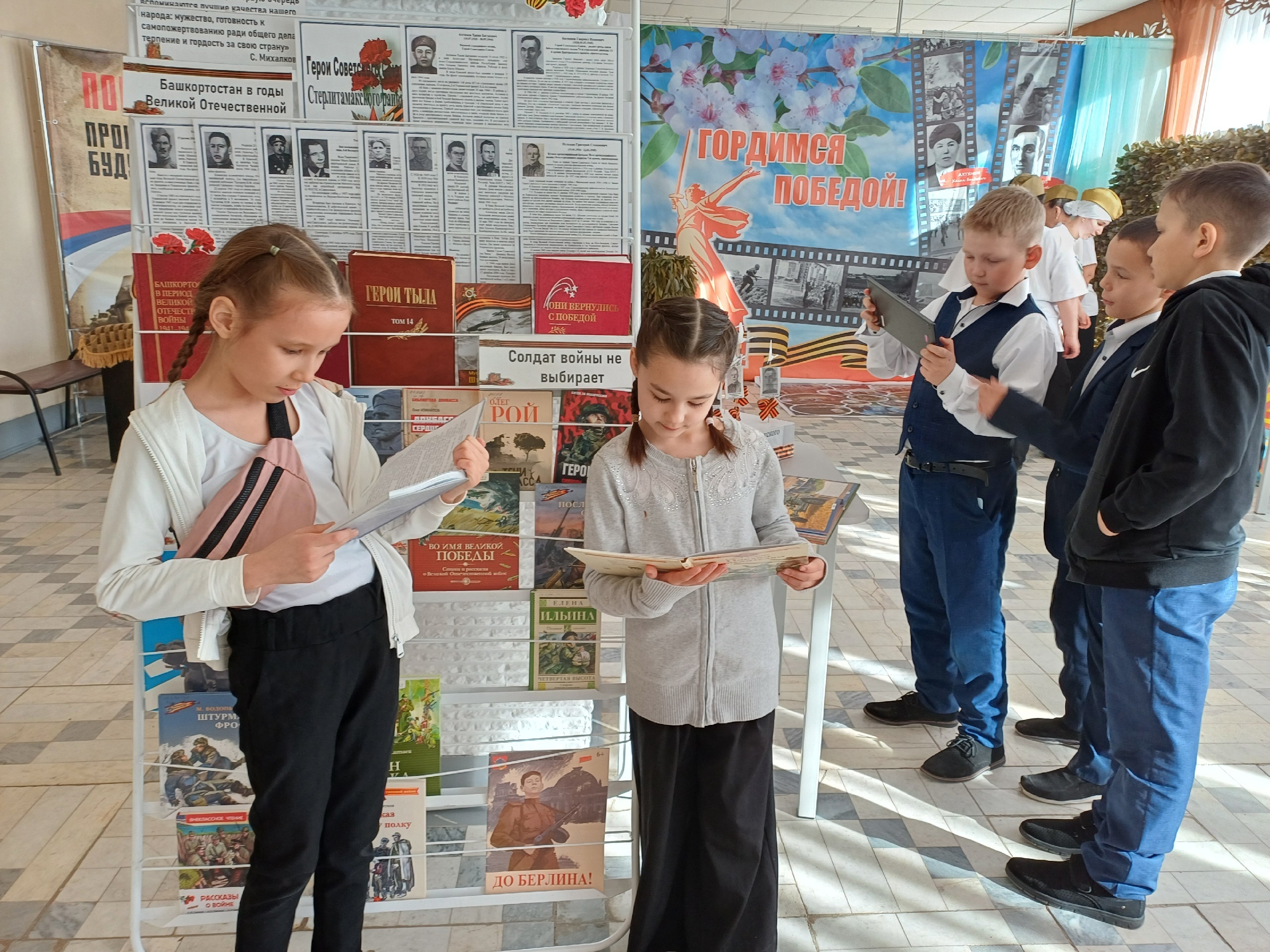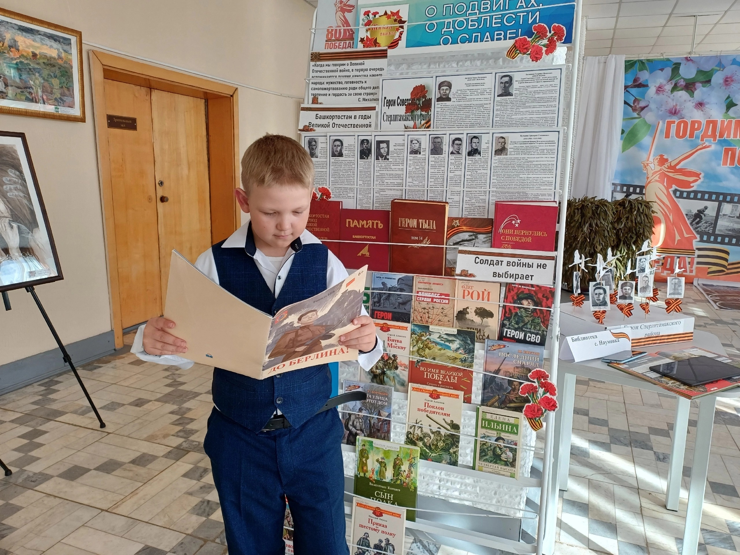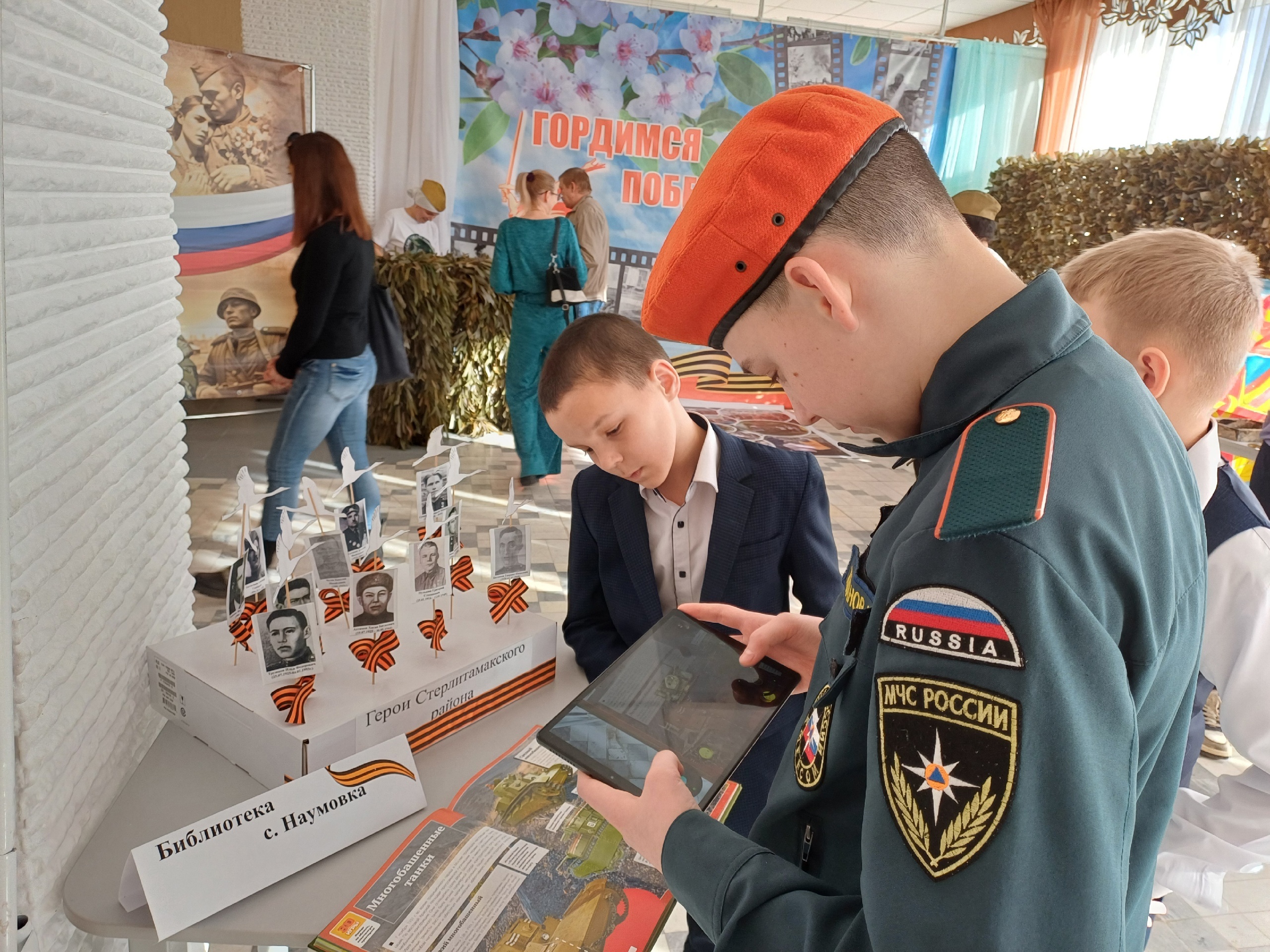 На стеллаже были представлены книги о подвиге солдат и совсем юных героев, а с помощью телефона или планщета маленький читатель мог изучить военную технику в 4Д-книге.