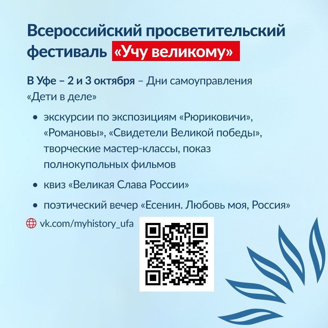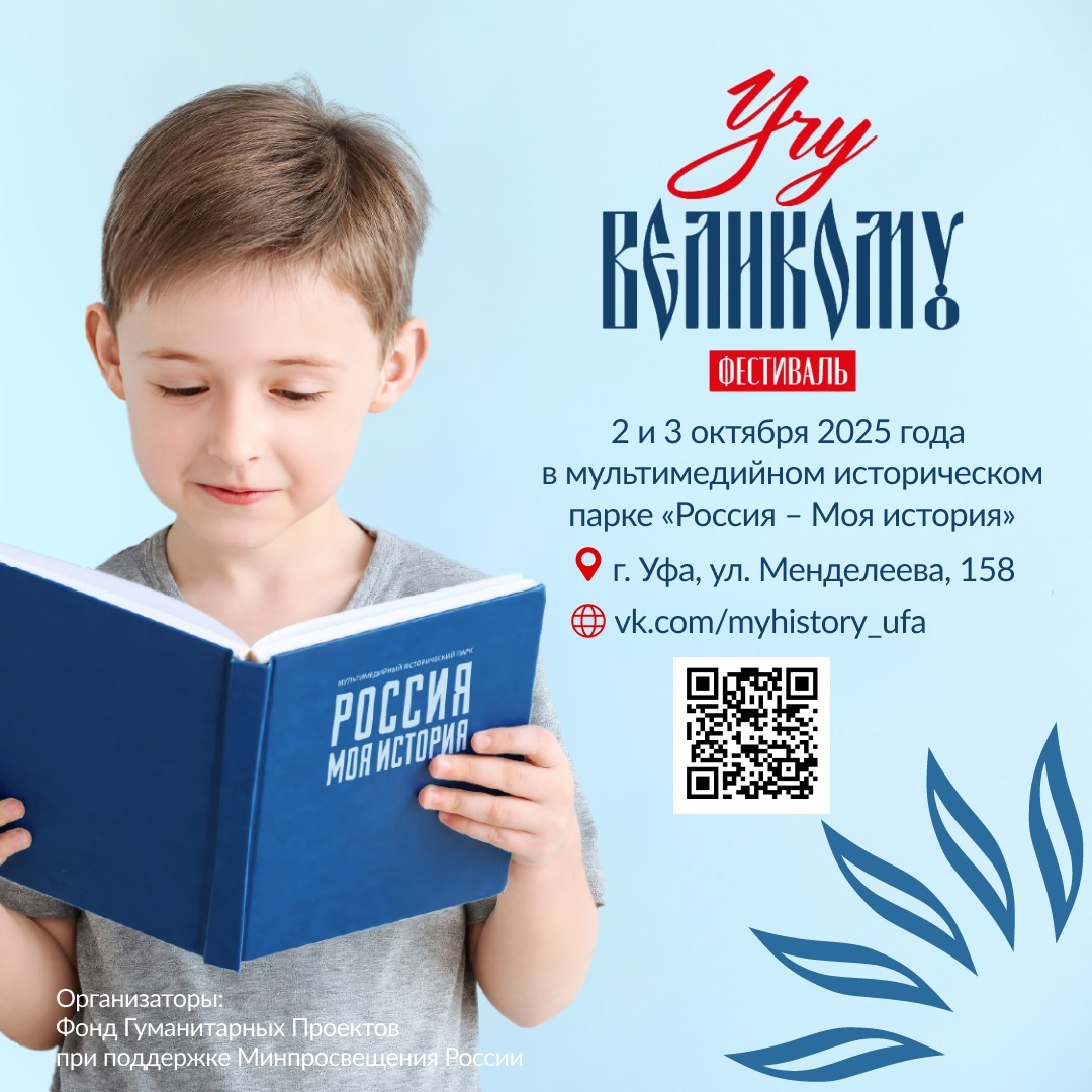 Уфа присоединится к федеральному фестивалю «Учу великому». Мероприятия пройдут в историческом парке «Россия – Моя история» 2 и 3 октября 2025 года. В дни фестиваля все мероприятия парка будут бесплатными.
