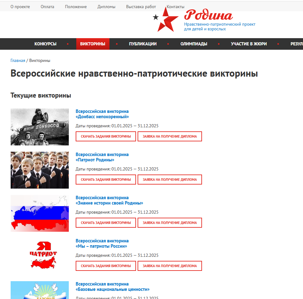 Знакомьтесь, портал «Родина». Он является всероссийским нравственно-патриотическим проектом, направленным на гражданско-патриотическое воспитание подрастающего поколения. На сайте можно найти информацию о патриотических конкурсах, олимпиадах и викторинах, которые проводятся в России.