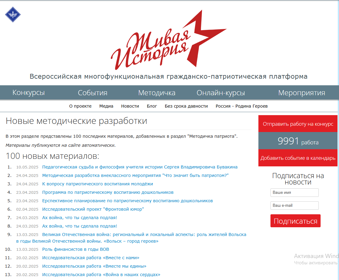 патриотических онлайн-конкурсов, форумов и иных мероприятий всероссийского масштаба. Информация об организации и вовлечении молодёжи в патриотические социальные проекты и другие тематические события.