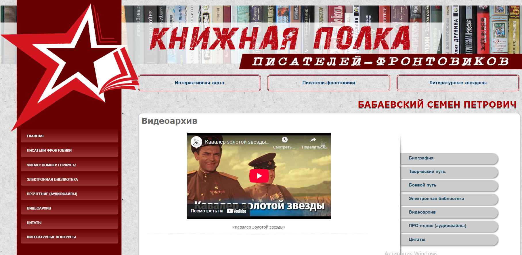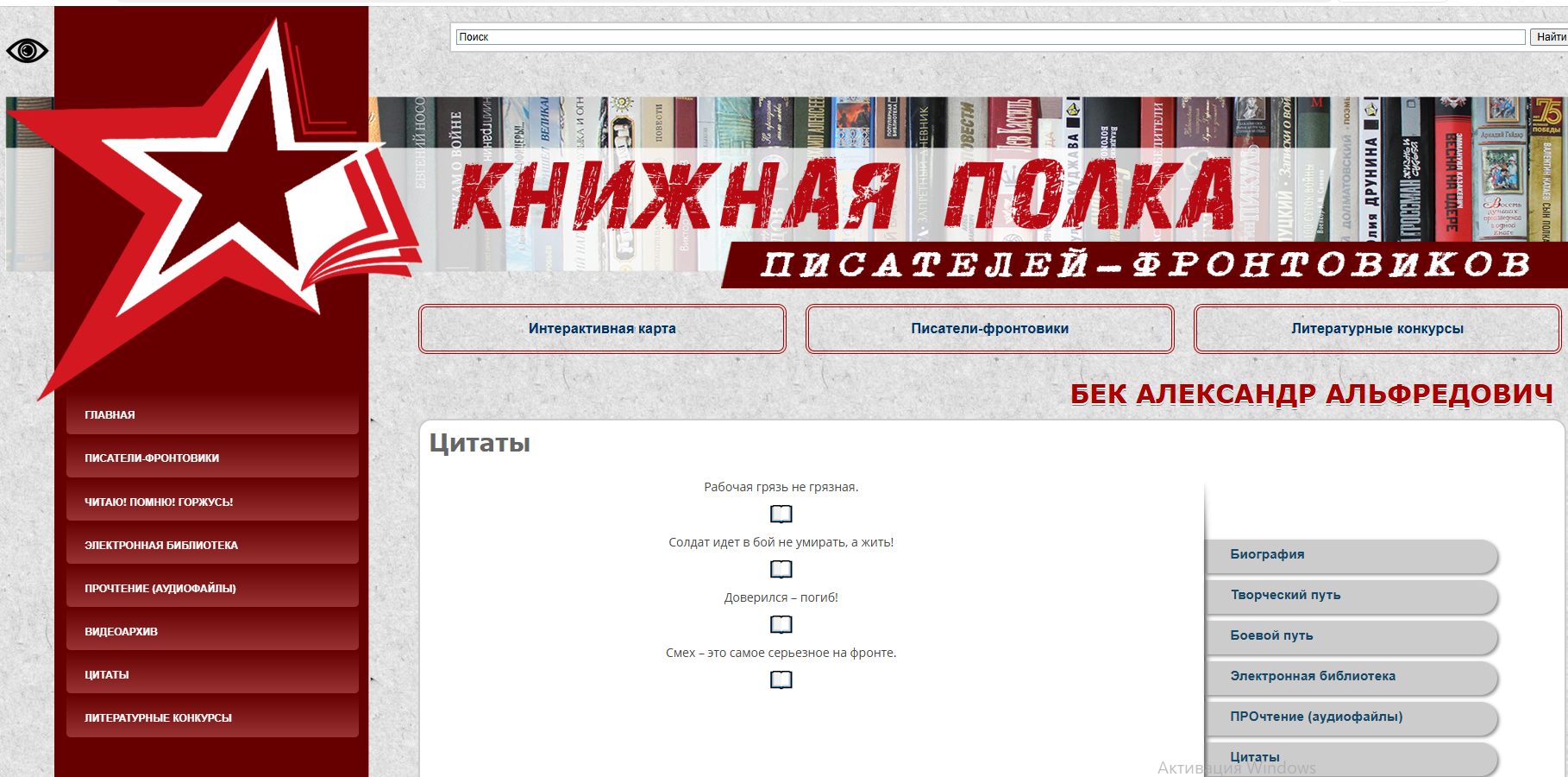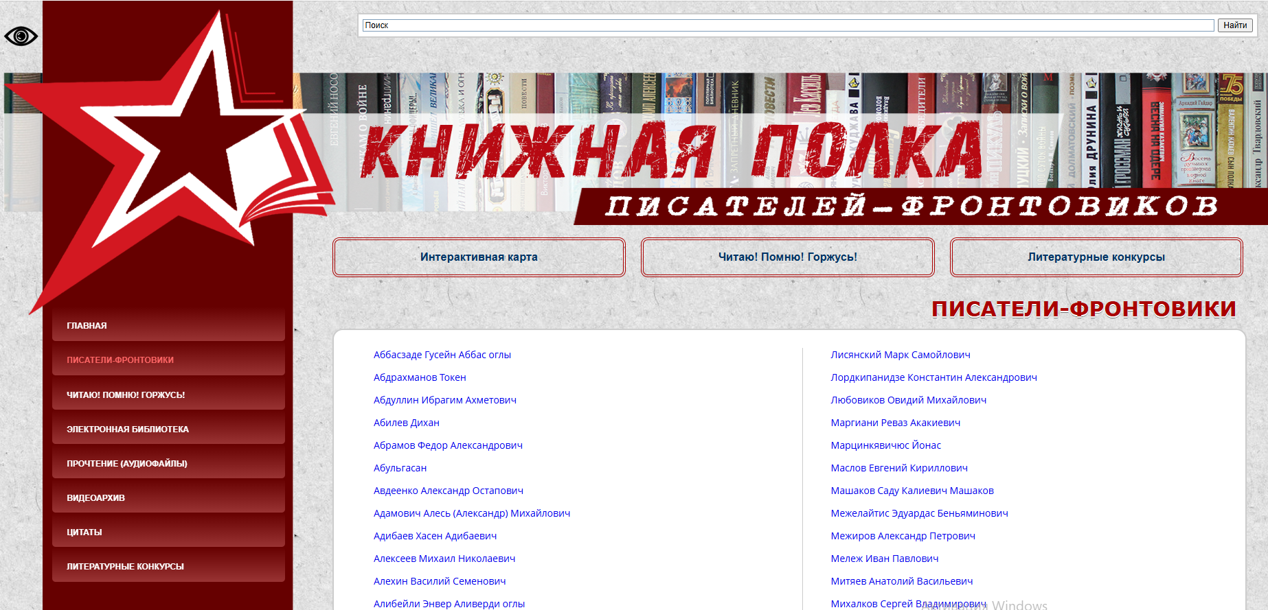 Литературно-патриотическая интернет-энциклопедия о творчестве писателей-участников боевых действий «Книжная полка писателей-фронтовиков» знакомит с золотым фондом героико-патриотической литературы с использованием современных технологий и интерактивных инструментов, объединив в себе разноплановую информацию о творчестве писателей-фронтовиков разных национальностей.