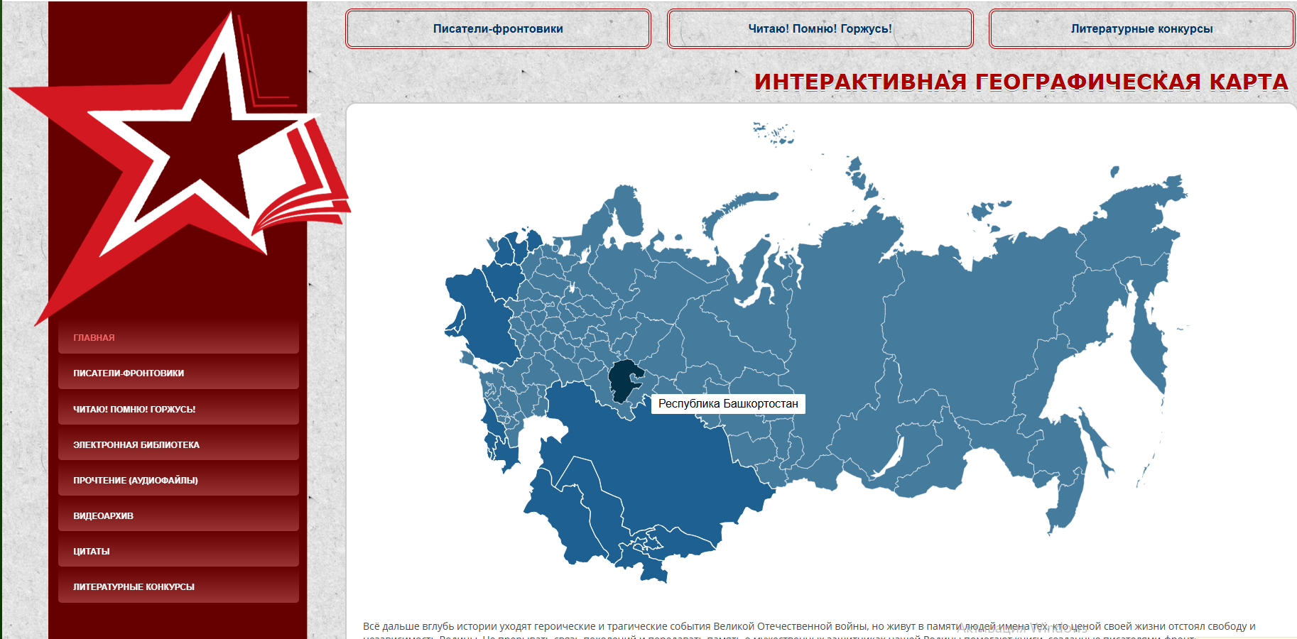— первый раздел «Интерактивная географическая карта» предоставит возможность пройти «дорогами войны» вместе с писателями-фронтовиками, узнать об увековечении их памяти в разных уголках России, а также познакомиться с местами, связанными с жизнью и творчеством современных писателей;