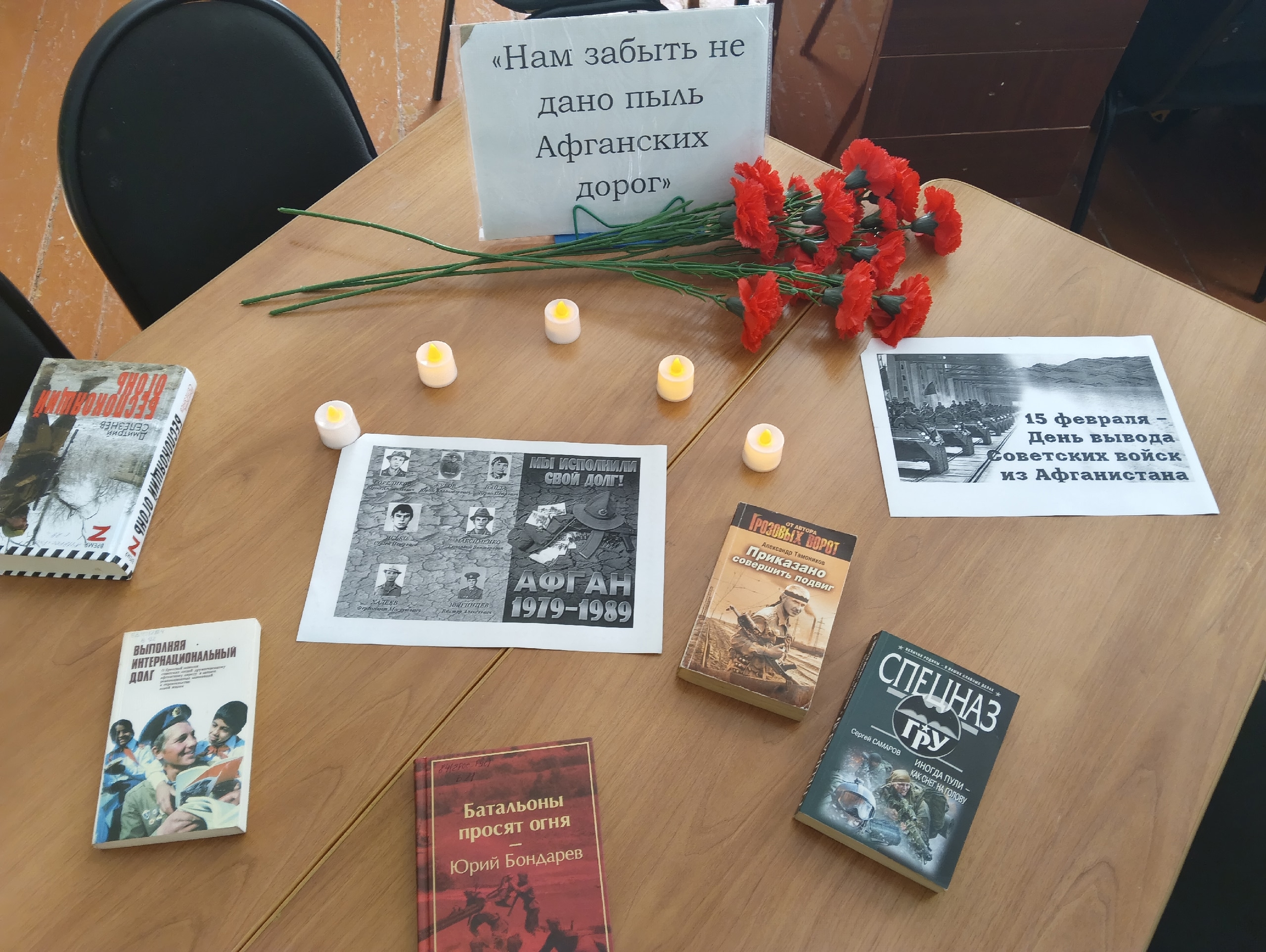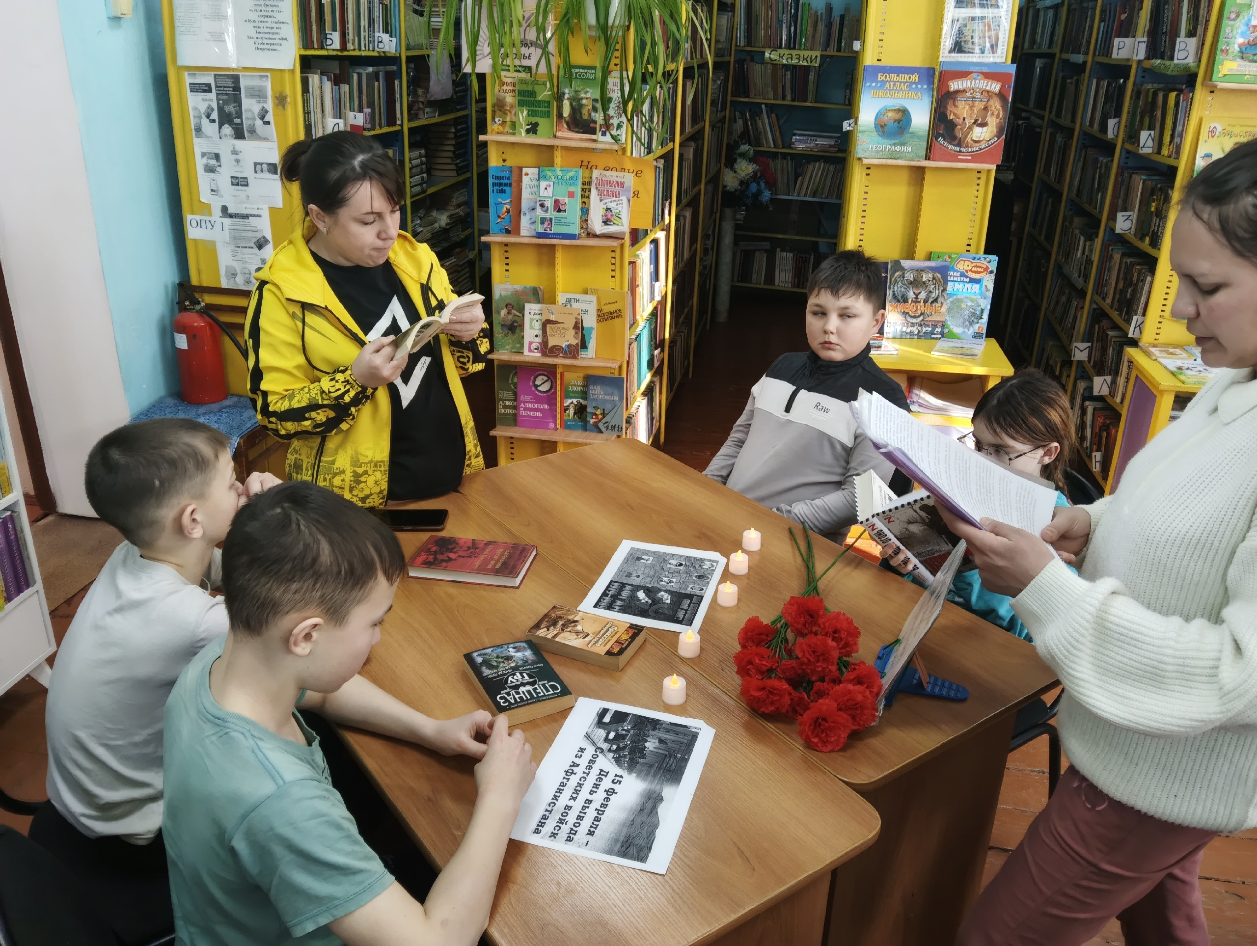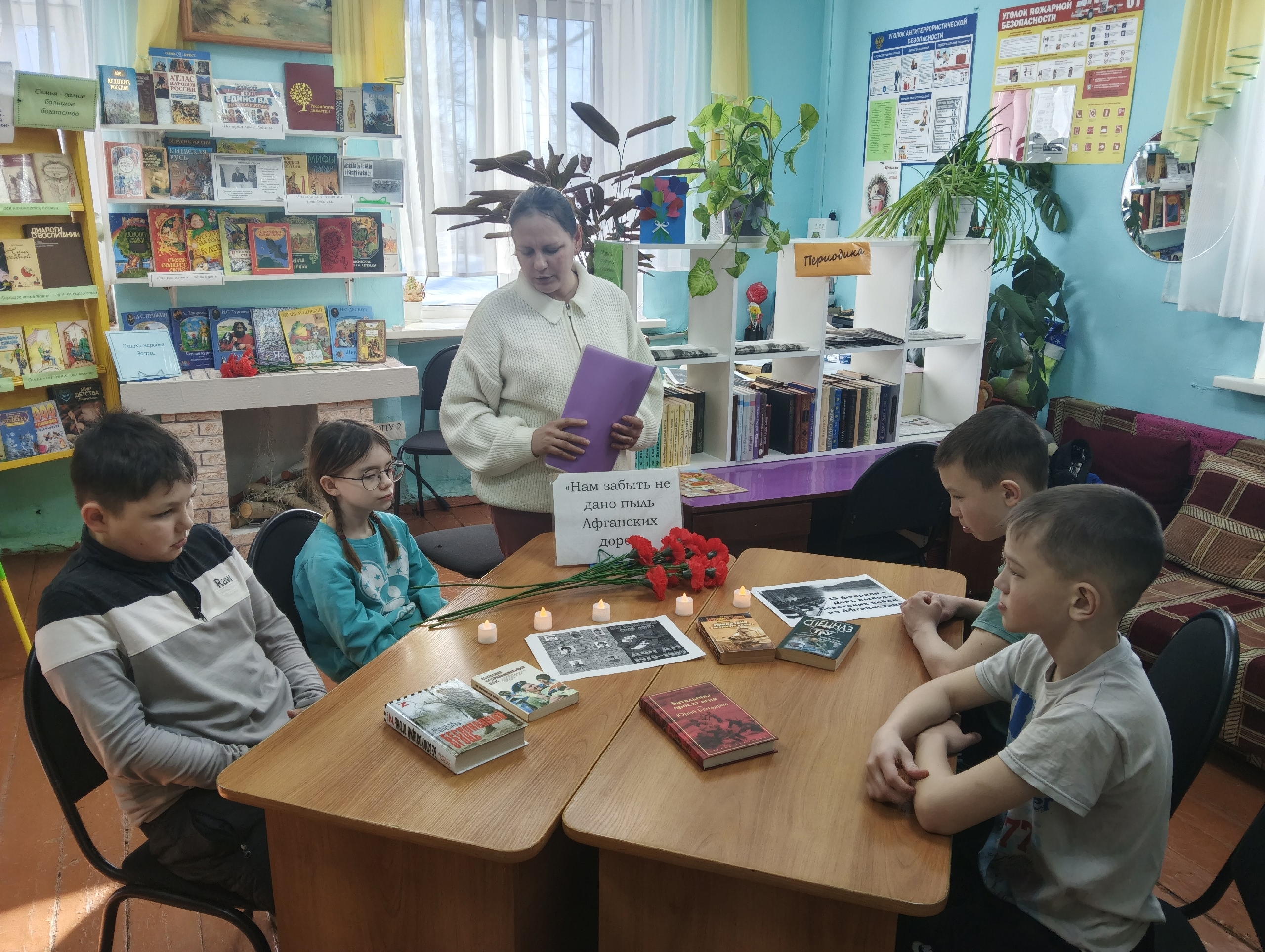 Библиотекарь совместно с сотрудниками СДК рассказали ребятам о героизме наших солдат, вертолетчиков и десантников. Многие из них вернулись с той войны возмужавшими, их грудь украсили ордена и медали. Но многим не суждено было вернуться к родному порогу, они погибли, выполняя свой долг.