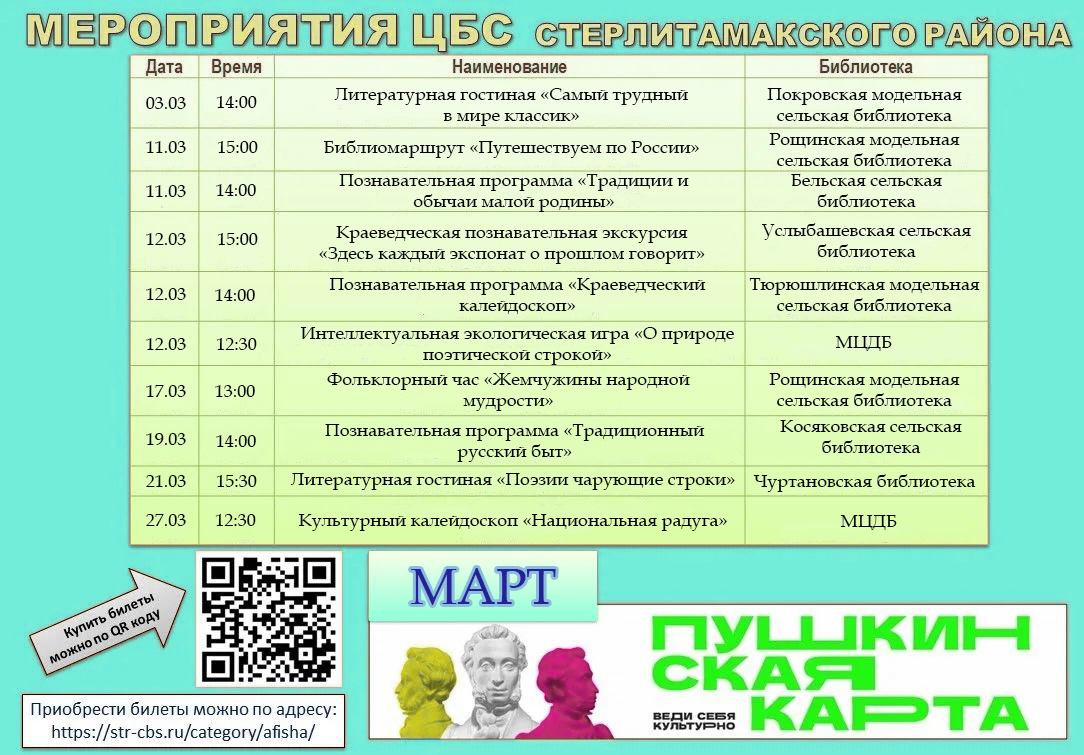 Афиша мероприятий по Пушкинской карте на март